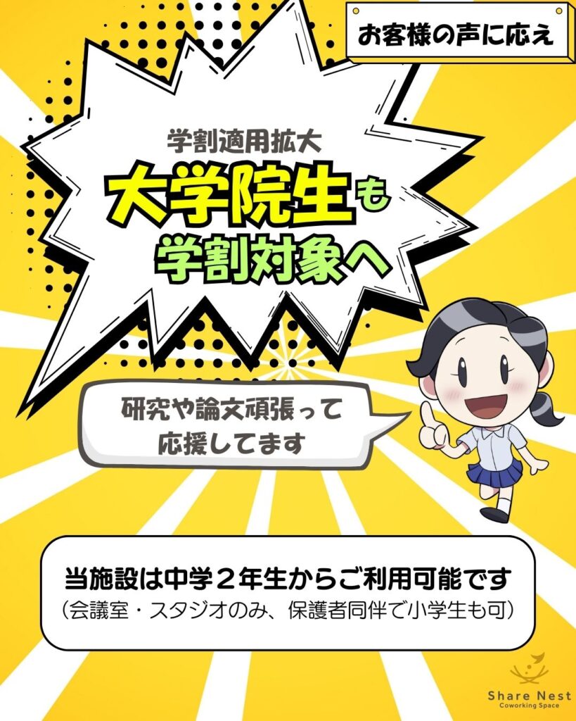 学割適用範囲を拡大しました! 2026 3/02 月額会員の学割は、大学4年生まででしたが、大学院生まで拡大しました。論文作成などにお気軽にご利用下さい♪ 月額料金はこちら Share Nest 仙川 この記事が気に入ったら フォローしてね! Follow @ShareNest_0623 Follow Me シェアネスト認定サークル活動 始動! 関連記事 シェアネスト認定サークル活動 始動! 2026年1月22日 レンタルモニター(24型)2台追加 2026年1月7日 施設見学歓迎(予約不要) 2025年10月14日