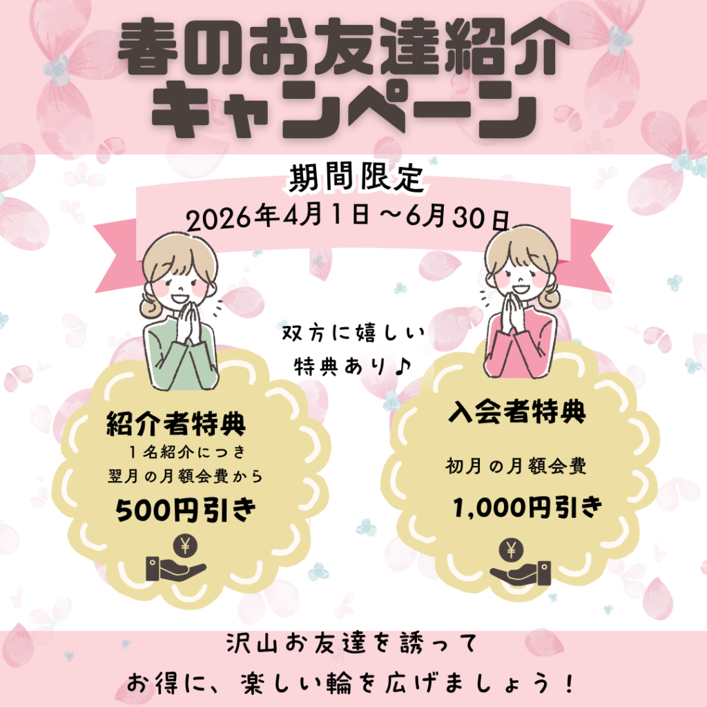 \ 今だけ /🌸春のお友達紹介キャンペーン🌸【2026年4月1日~6月30日限定】 ✔ご紹介者さま→翌月の月額会費から【500円OFF】 ✔ご入会者さま→初月の月額会費【1000円OFF】 「気になっているけど、まだ来れてない」そんなお友達... -